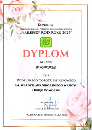 Na zakończenie spotkania członkowie Zarządu ROD poinformowali Komisję Rewizyjną o zgłoszeniu przez Zarząd ROD dwóch działek do konkursu „Wzorowa działka 2025”, którego organizatorem był Okręg Pomorski PZD w Gdańsku. Dzierżawcy tylko jednej działki otrzymali wyróżnienie oraz nagrodę finansową. Ponadto Zarząd ROD wytypował jedną najpiękniejszą działkę w ROD po przeprowadzonym przeglądzie, która została zgłoszona do Okręgu Pomorskiego PZD w Gdańsku. Zgłoszenie nastąpiło na podstawie podjętej uchwały Zarządu ROD, która następnie została przekazana do Okręgu Pomorskiego PZD w Gdańsku. Celem podjęcia takiego działania przez Okręg Pomorski PZD w Gdańsku było zaangażowanie Zarządów ROD z woj. pomorskiego oraz indywidualnych działkowców do udziału w ogłaszanych konkursach okręgowych jak i krajowych. Ponadto w roku bieżącym Zarząd ROD, zgłosił ogród do konkursu „Wzorowy Rodzinny Ogród Działkowy 2025 Roku”, którego organizatorem był Okręg Pomorski w Gdańsku, gdzie ogród zajął I miejsce oraz został zakwalifikowany do udziału w konkursie organizowanym przez Jednostkę Krajową PZD pt. „Najlepszy ROD Roku 2025”. W tym konkursie ROD im. W. Sikorskiego w Gdyni otrzymał Dyplom wyróżnienie, które motywuje Zarząd ROD do jeszcze bardziej wytężonej pracy na rzecz ogrodu.
